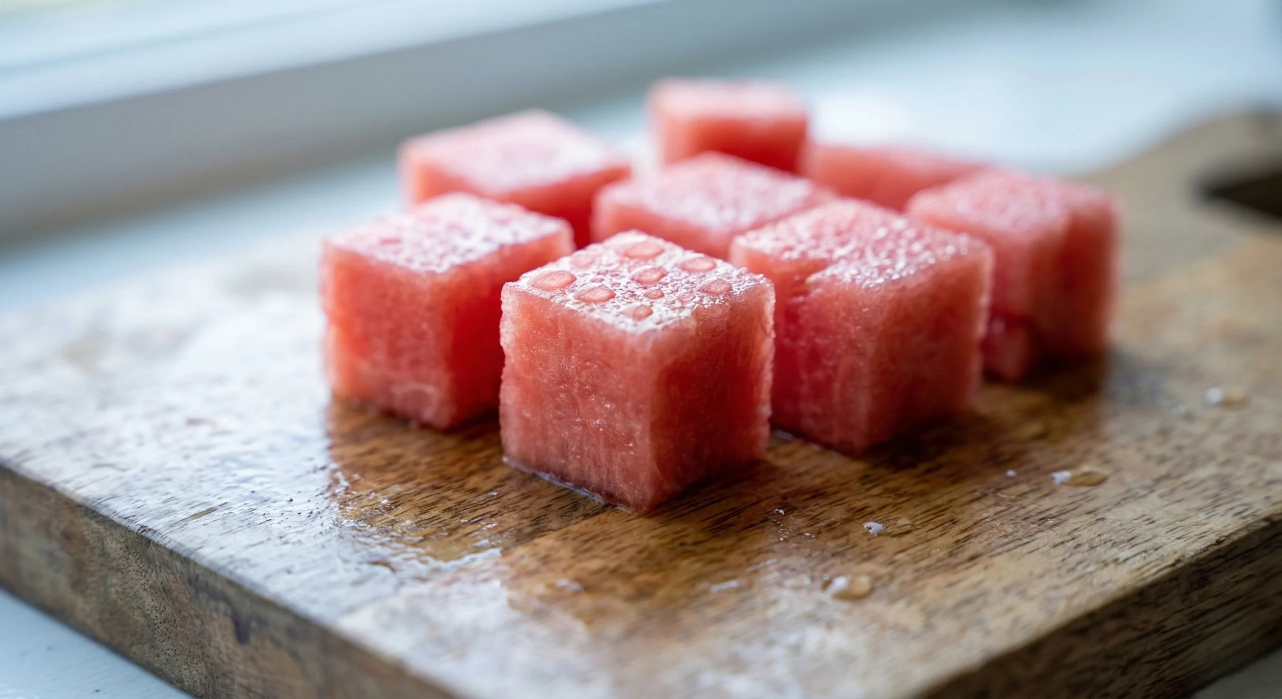 Cut the watermelon into small bite-sized cubes. Dice the cucumber and thinly slice the red onion.