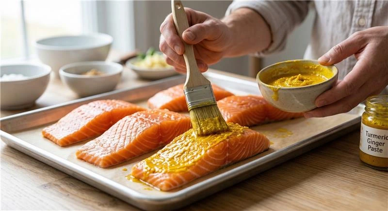 Place the salmon fillet in a small dish and coat it evenly with the turmeric ginger marinade. Let it marinate for about 10 minutes so the flavors absorb.